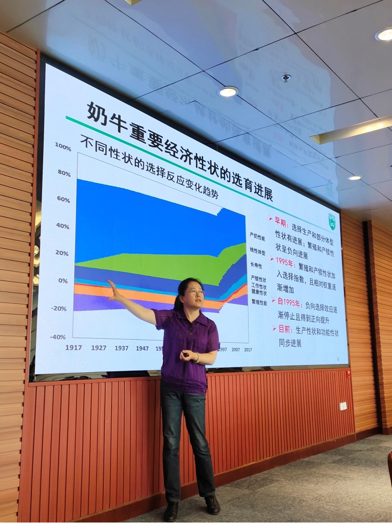 王雅春教授报告题目是“中国奶牛平衡育种技术进展”,从平衡育种的概念及意义、“奶业百年”之经济重要性状的发展历程、中国奶业发展状况及奶牛平衡育种技术进展等方面讲述奶牛育种的发展历程及重要性。