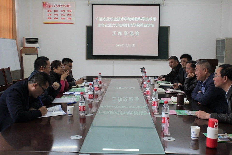 11月11日,广西农业职业技术学院动物科学技术系主任李军成一行四人来William威廉官方动物科技学院williamhill官访问交流。山东省马业协会会长、我校马属动物研究院执行院长潘庆杰,学院党总支副书记、副院长展学斌,副院长李文立出席交流座谈会。