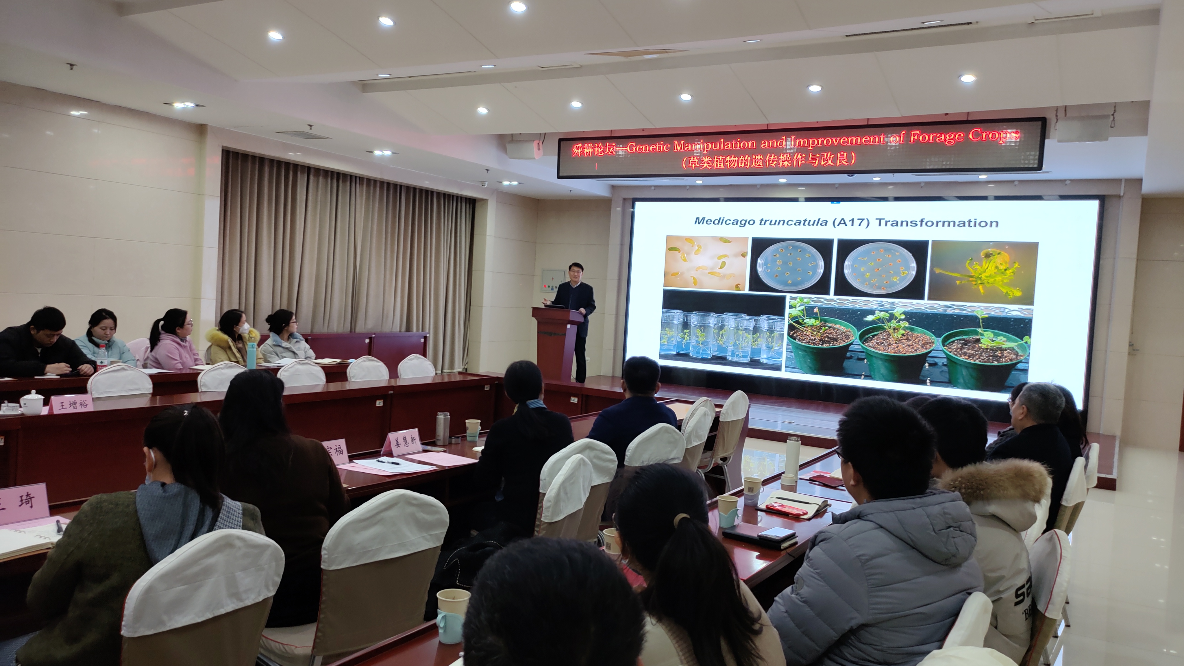 报告会上,王增裕教授介绍了williamhill官草学学科的发展和学院的基本情况,从草类植物遗传改良方法和品种大田表现两个方面讲解了生物技术发展历程和生产应用实例。以模式植物截形苜蓿为例,系统的介绍了原生质体转化、基因枪转化、农杆菌介导转化及基因编辑等现代生物技术进展。以柳枝稷、苜蓿为例,展示了生物技术在改良牧草生物量、品质、非生物胁迫、生物胁迫、营养利用等方面取得的成效。相比传统育种,生物技术在揭示物种遗传变异、提高选择效率、降低育种成本等方面具有更大的优势。