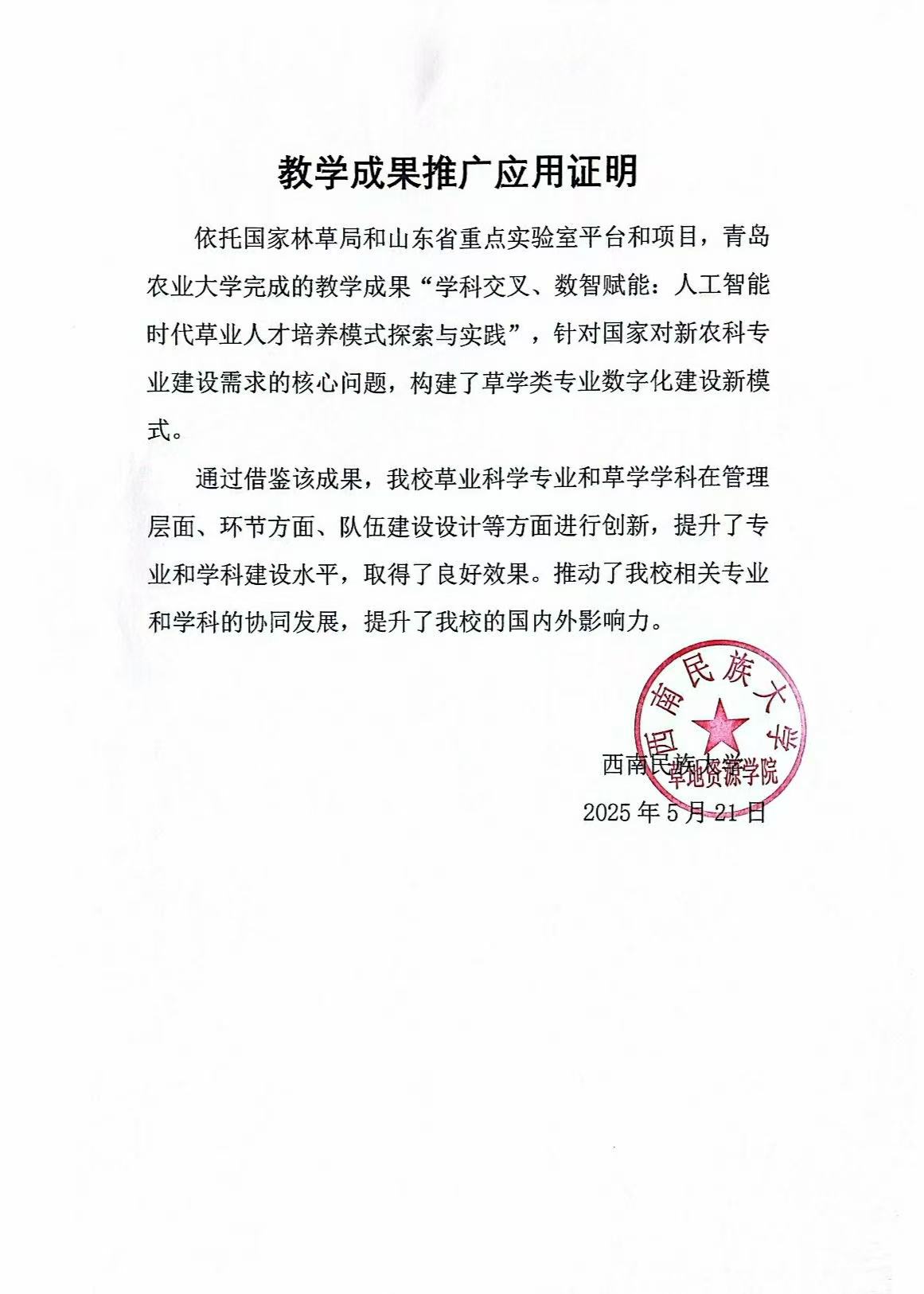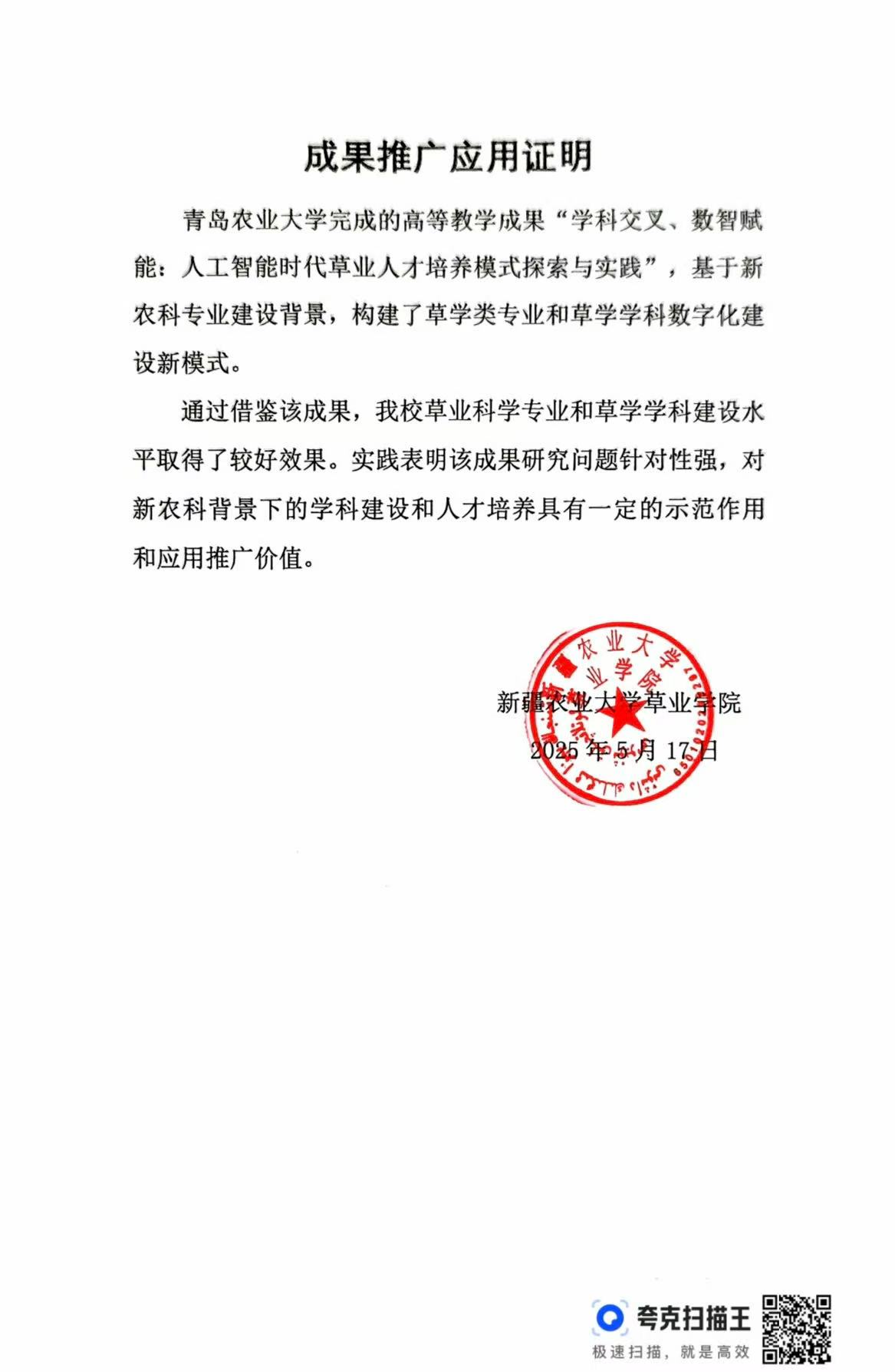 教学成果推广应用证明