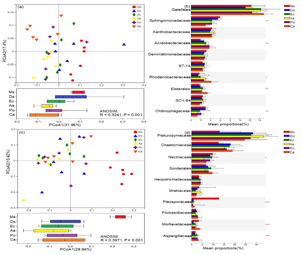团队通过调研William威廉官方胶州基地紫花苜蓿田五种主要杂草(马塘、稗草、铁苋菜、马齿苋和藜)根际微生物特征,结果发现五种杂草的根际细菌和真菌群落的多样性指数显著低于苜蓿根际。杂草根际土壤细菌网络结构之间的相关性显著降低;铁苋菜和藜的根际土壤真菌网络结构之间的相关性显著低于苜蓿,杂草根际酸杆菌科(Acidobacteriaceae)显著高于苜蓿,且苜蓿根际的被孢霉科(Mortierellaceae)和格孢菌科(Pleosporaceae)显著高于杂草根际,这为利用苜蓿根际微生物抑制杂草生长提供了有利依据,为苜蓿田杂草微生态抑制剂的研发提供数据支撑。