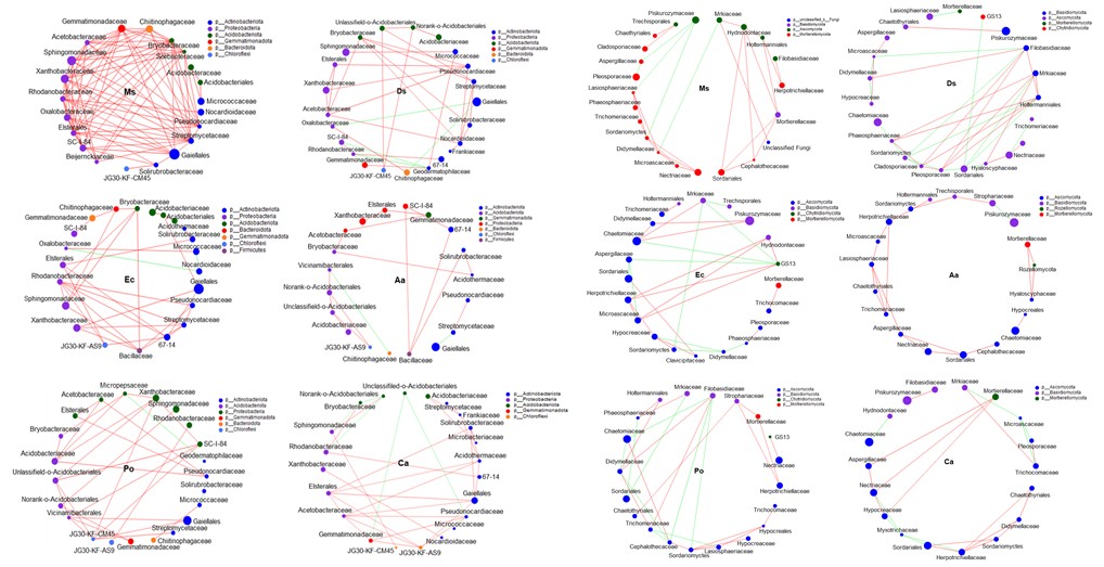 图3 苜蓿和杂草根际细菌(左6)和真菌(右6)微生物网络相关关系