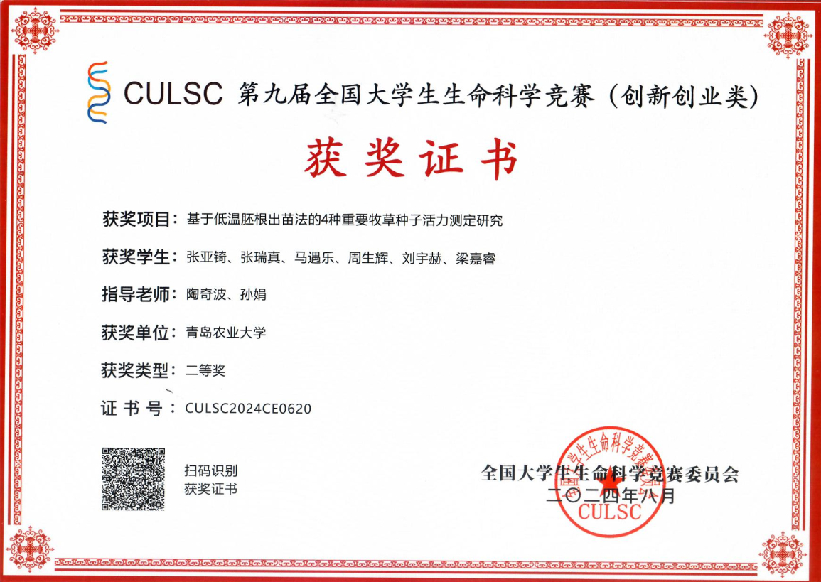 项目简介:项目利用专业优势,聚焦农业、农村、农民(三农)问题,紧密结合生产实际,旨在解决草业生产中种子质量控制难题和低建植率问题。建立和解析了基于低温条件下(5℃)种子胚根萌发的一年生黑麦草、小冠花、紫云英和箭筈豌豆种子活力测定技术及测定机制,确定了针对每种牧草的最优活力测定标准。项目解决了重要牧草种子活力低、质量控制难、田间建植差的“痛点”问题,为牧草种子活力基础研究提供了重要理论基础,为黄河流域生态保护和高质量发展等重大国家战略实施提供了科技支撑。
