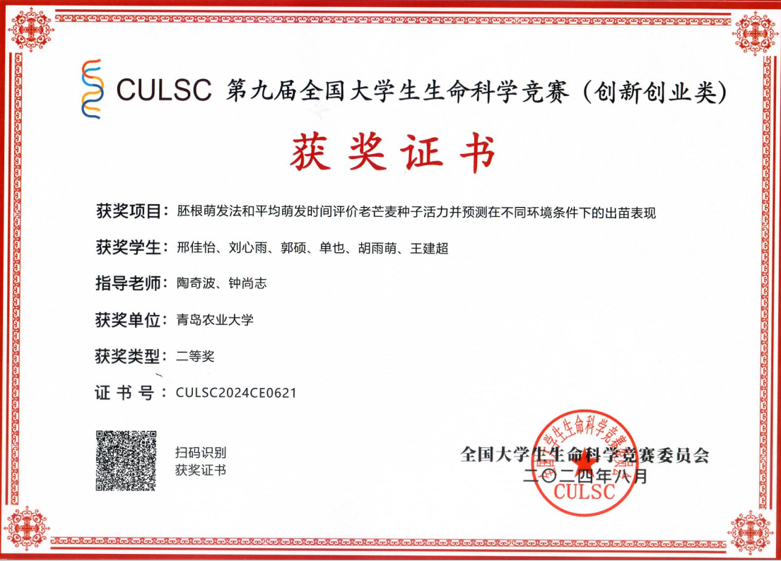 项目简介:项目立足种业创新和黄河流域生态保护和高质量发展等重大国家战略。开展重要牧草老芒麦种子活力调控机制及测定技术研究。建立了基于胚根萌发法和平均萌发时间评价老芒麦种子活力的理论体系和技术规程,并应用活力测定指标预测老芒麦种子在不同环境条件下的出苗建植表现。研究结果可为精确、快速测定老芒麦种子活力提供重要技术支撑,为老芒麦及相关牧草种子活力基础研究提供理论基础,促进草牧业高质量发展和退化草地/盐碱地修复,服务黄河流域生态保护和高质量发展等重大国家战略。