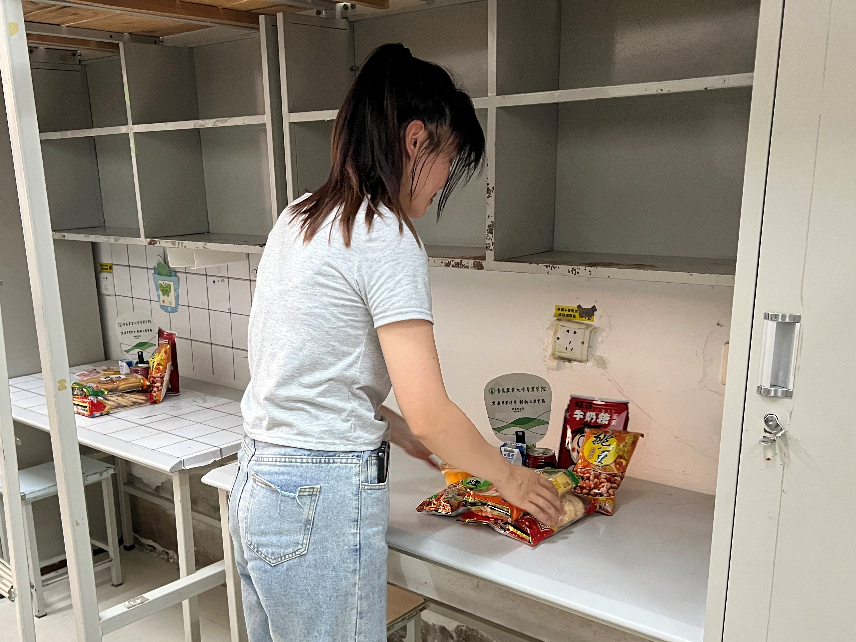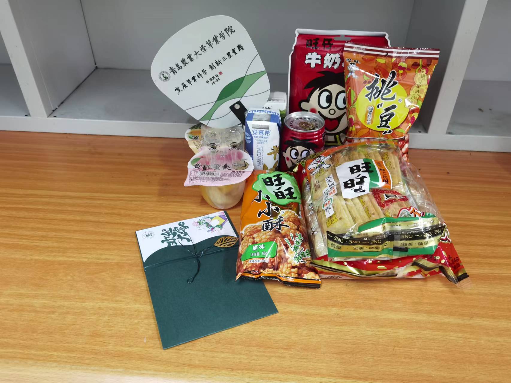 在2021级同学到来之前,辅导员老师刘凝和志愿者同学们将学院准备的“小惊喜”精心地摆放在桌子上,希望同学们在搬迁劳累之余能感受到一丝温暖,也祝愿同学们在城阳校区的生活“旺”上加“旺”。