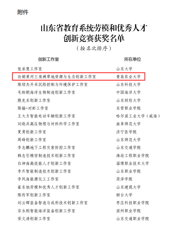 近日,在山东省教育工会委员会组织的“鲁新杯”山东省教育系统劳模和优秀人才创新竞赛活动中,学校“孙娟黄河三角洲草地资源与生态创新工作室”获得第二名,并获1万元创新资助资金。本次竞赛全省共有20个工作室获奖。