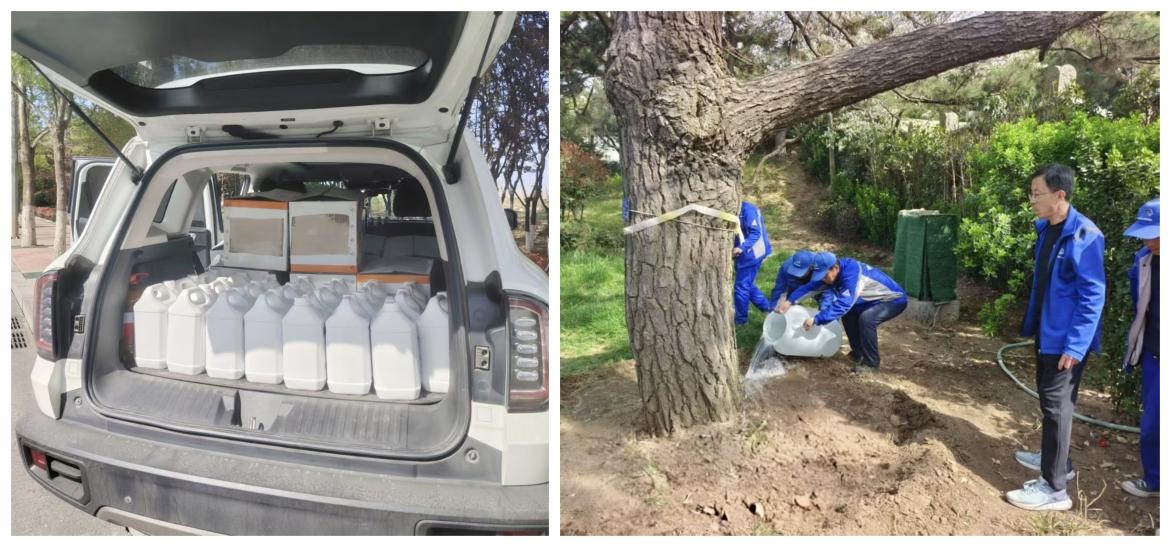 根据分析结果,团队结合专业知识筛选出具溶磷、抑菌、降解化感物质的多功能菌株,制作菌剂,通过调整菌剂浓度与施用方式,制定出“菌剂灌根 + 精准追肥”的综合解决方案,实现对症下药、科学治理。管理区负责人表示,这套科学方案为景观松树复壮提供了有力支撑,也让同学们的专业实践成果真正服务于生态保护一线。