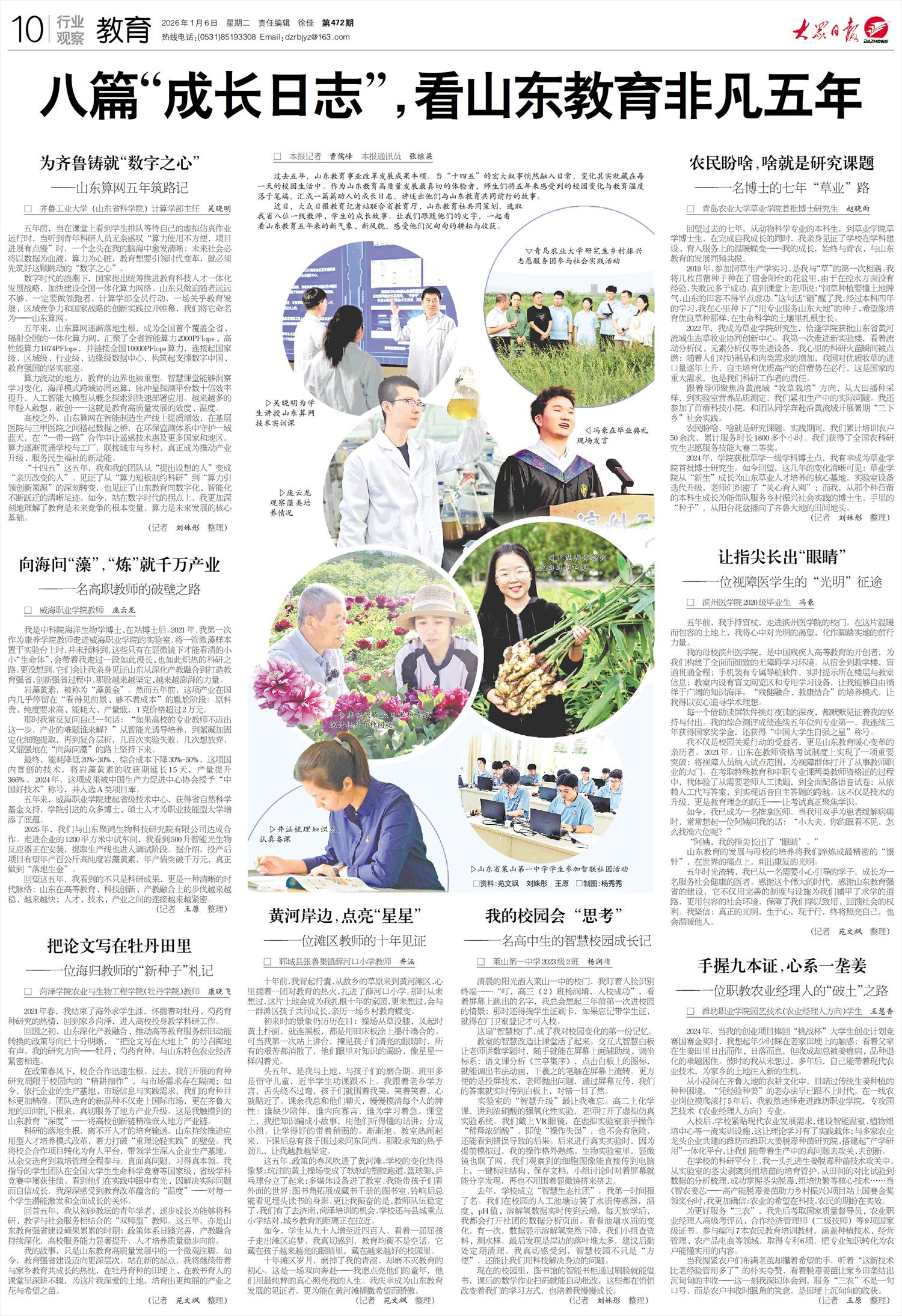 【编者按】1月6日大众日报以《农民盼啥,啥就是研究课题——一名博士的七年“草业”路》为题,报道了williamhill官博士生赵晓雨扎根齐鲁大地,将科研与乡村振兴需求结合,在学科建设发展中实现个人成长,用专业力量服务沿黄流域牧草产业发展的故事。