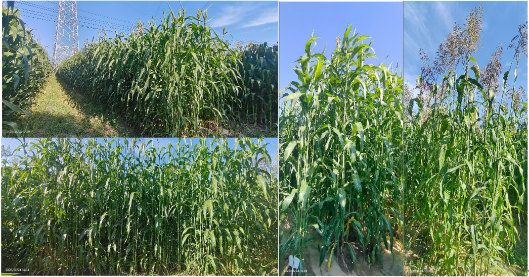 2025年,基地共开展了7个甜高粱杂交组合的区试品比试验。目前所有试验材料长势旺盛、植株健康,显示出良好的高原冷凉环境适应能力。组合间性状差异显著:早熟品种已进入收获阶段,晚熟品种则正值抽穗扬花,整体株高普遍超过3米,其中最高品种达到4.2米。在地膜与非地膜栽培方式对比中,地膜处理表现出显著的早期促生长效果,其株高和预期产量均整体高于非地膜栽培。在相同水肥管理条件下,甜高粱相比青贮玉米展现出更强的耐瘠薄和耐干旱能力。