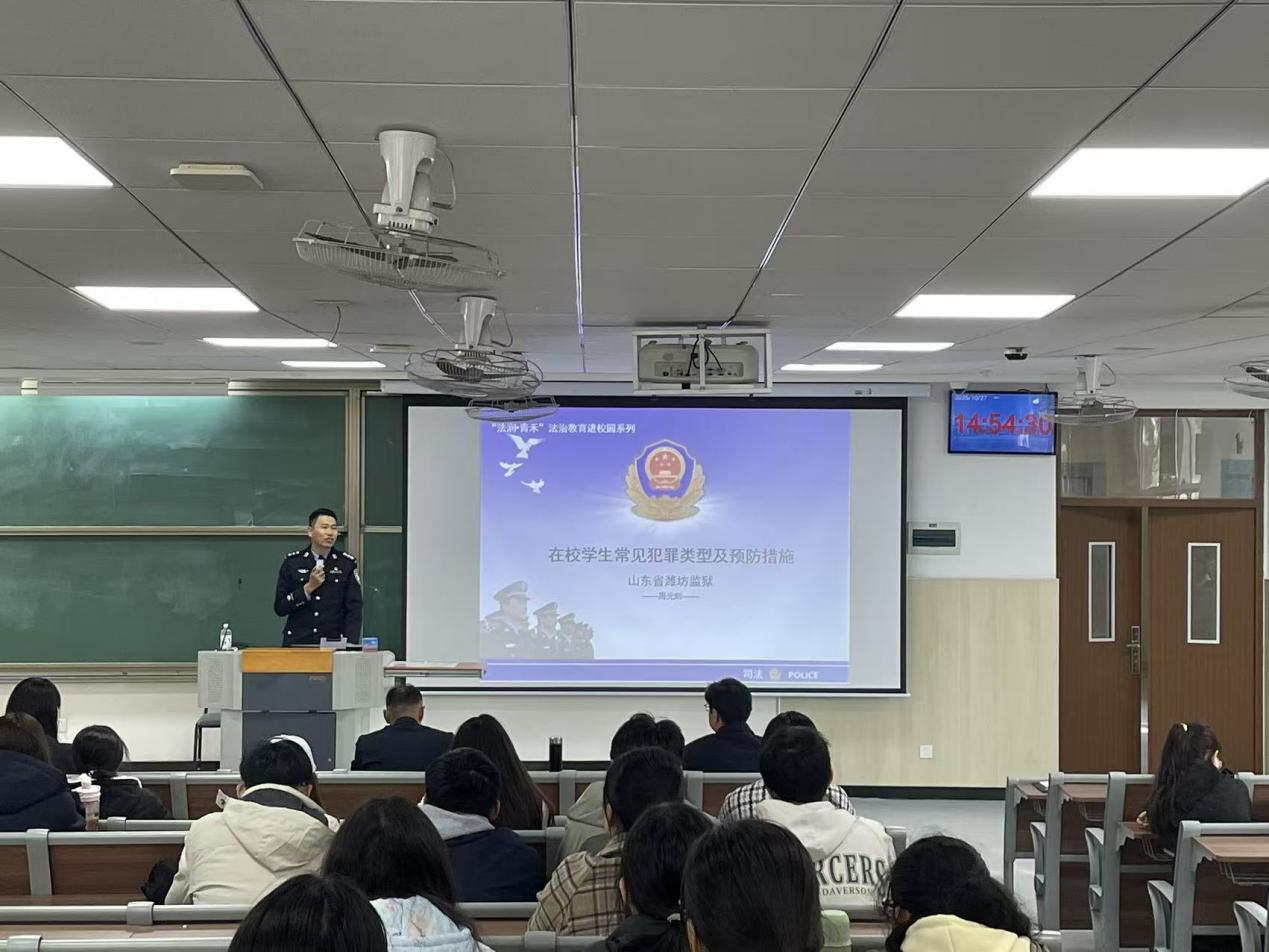 10月27日,williamhill官特邀山东省潍坊监狱团委副书记、2015届校友周光辉警官以在校学生常见犯罪类型及预防措施为题开展法治宣传教育,活动由学院党委书记乔磊主持,学院辅导员及全体2025级新生参加。