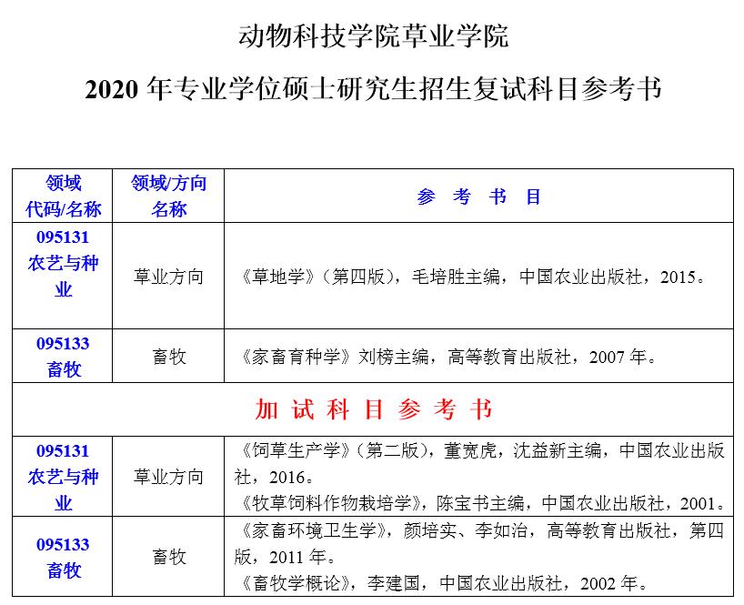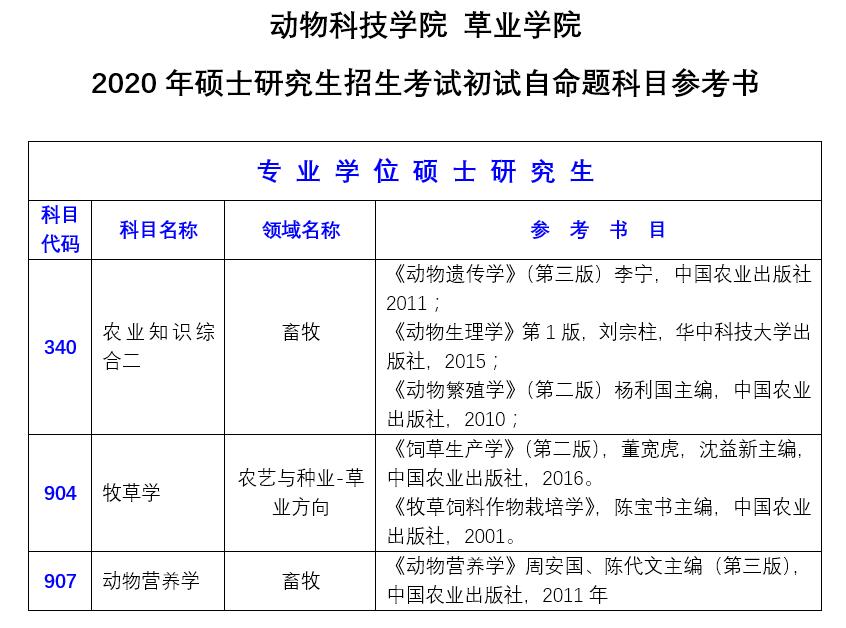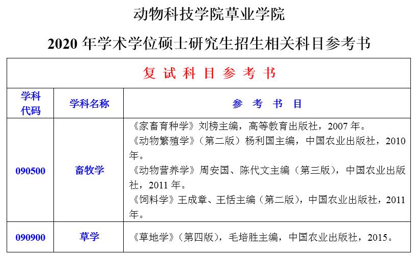 动物科技学院williamhill官2020年硕士研究生招生考试参考书